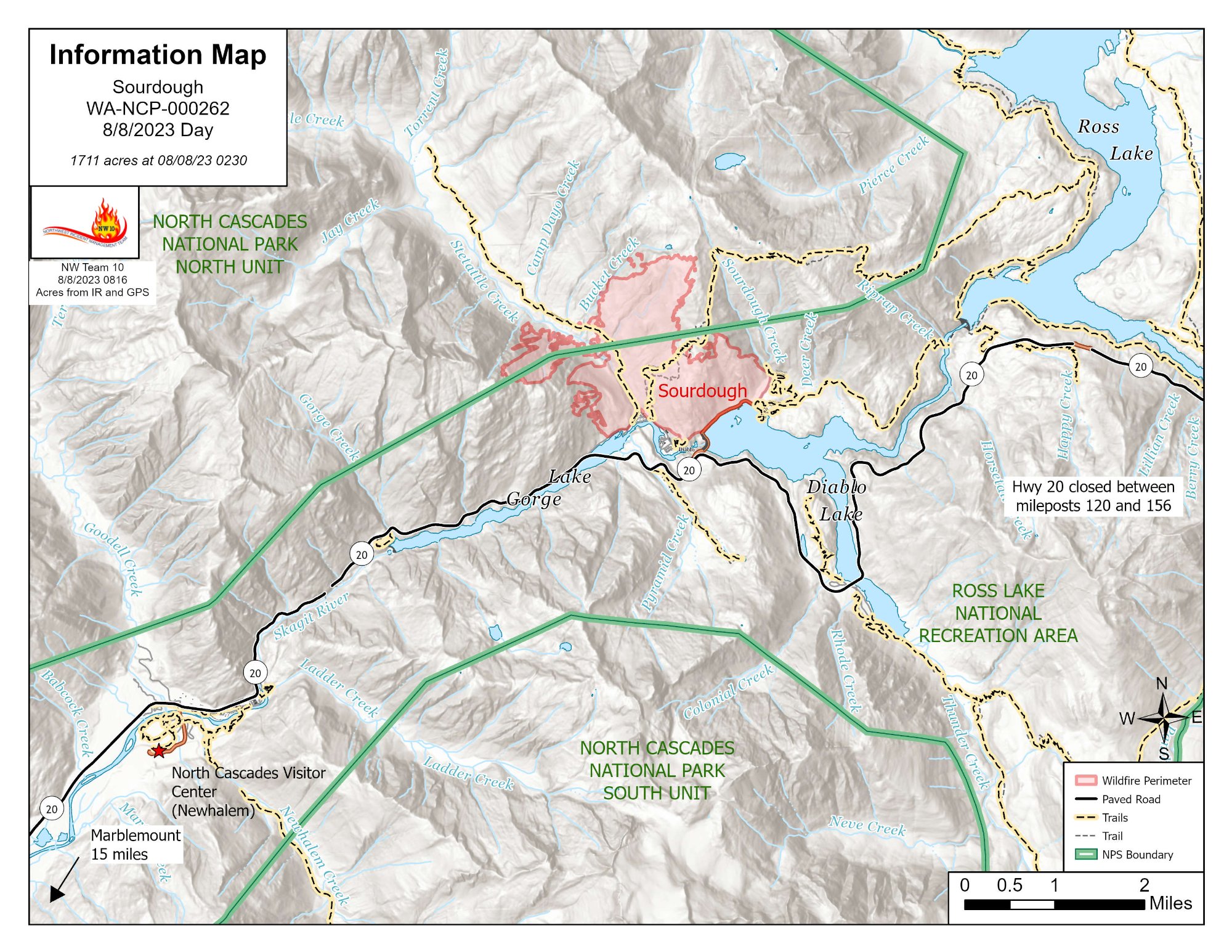 (Newhalem, Wash.) -- The Sourdough Fire started with a lightning strike on July 29 near Diablo in the steep and rugged terrain of Ross Lake National Recreation Area, 7 miles northeast of Newhalem. An infrared flight overnight has provided new mapping data. An estimated 1,711 acres have burned on the Sourdough Fire. Due to hazards presented by the fire, State Route 20 (North Cascades Highway) has been closed until further notice between Mile Marker 120 and Mile Marker 156, Newhalem to Rainy Pass. The safety of firefighters and the public are the top priority on the Sourdough Fire.