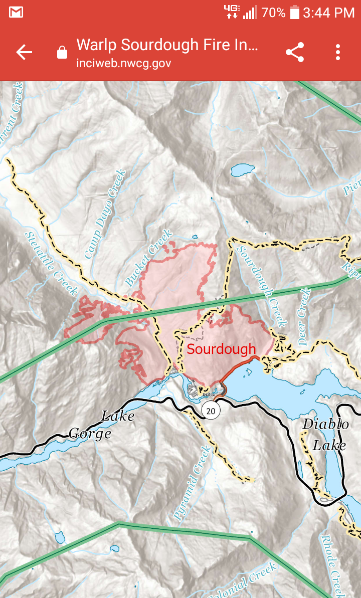 If you look at the perimeter maps the fire perimeter nearly touches Gorge Lake just S of Diablo, and it isn't that far from there to highway 20.