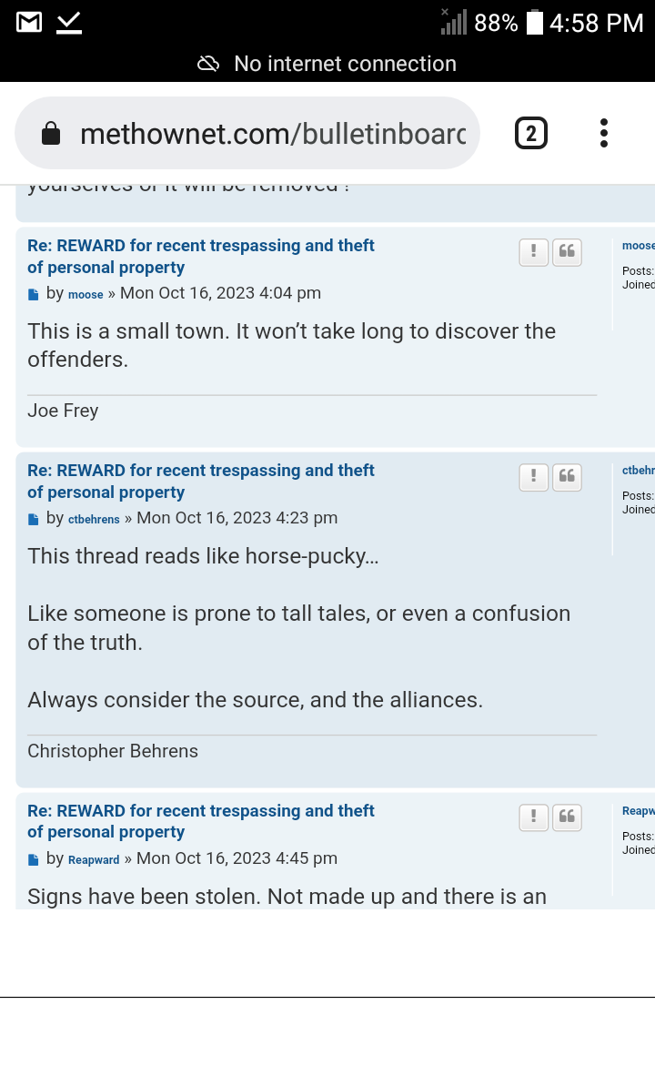 Stolen signs being debated with OP being attacked by Chris Behrens at MethowNet BB. Another post asking for thread to be taken down.