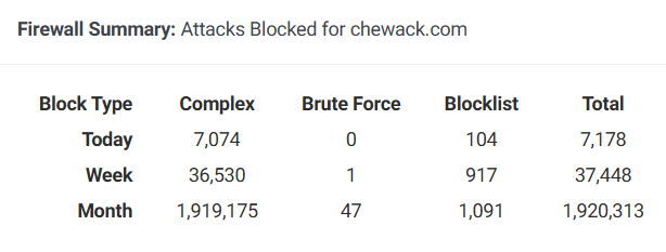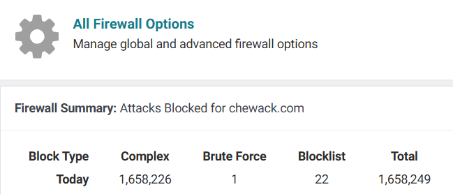 Added Wordfence Premium to intercept attacks on the chewack.com hosting site... The attacks are insane!!! They were using up all the resources on the server and causing problems.