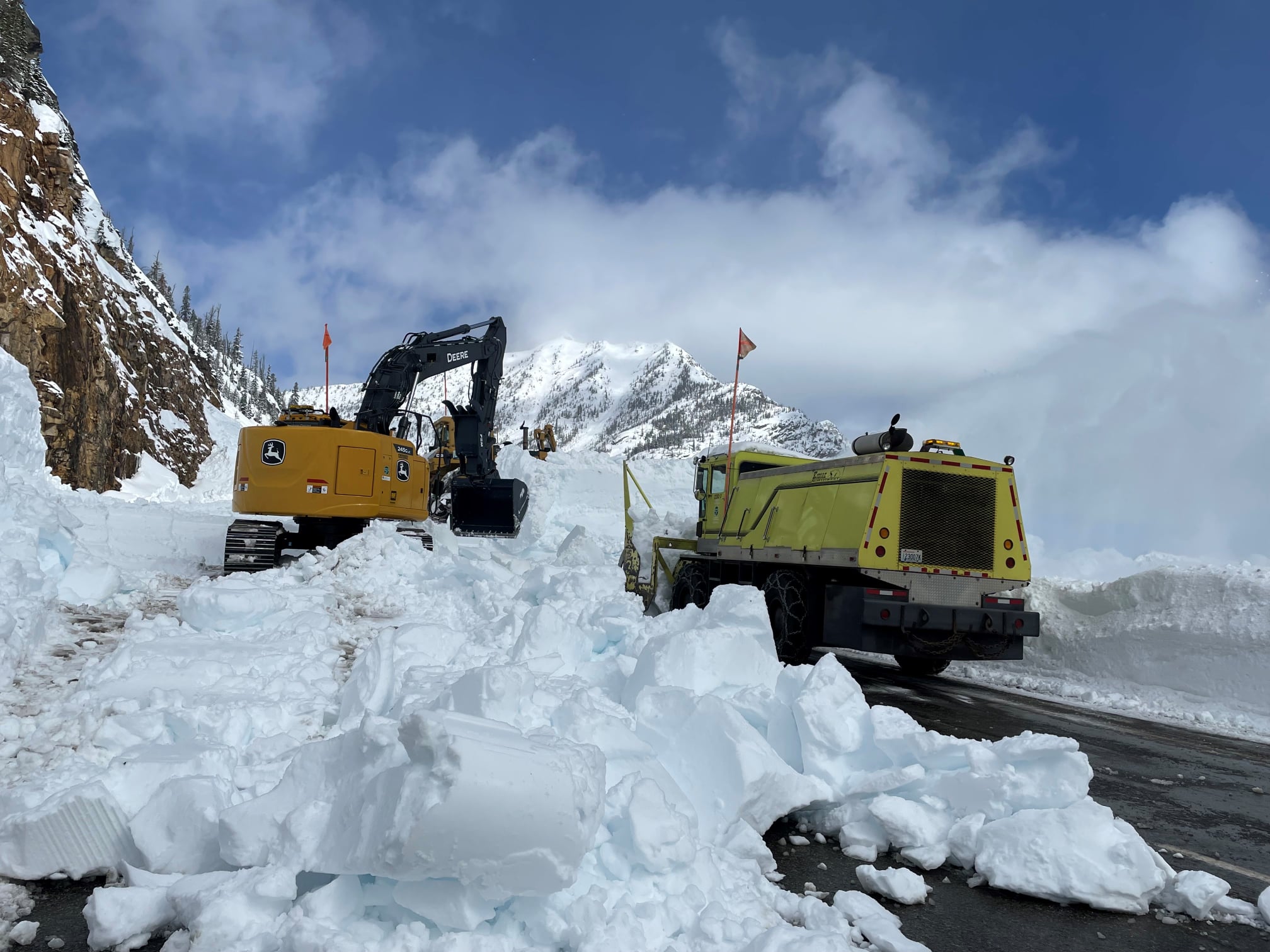 From the west side, crews reached milepost 150. With the Liberty Bell chutes still ahead on the east and a week of snowfall on the uncleared road between the east and west crews, reopening is still a couple weeks away.