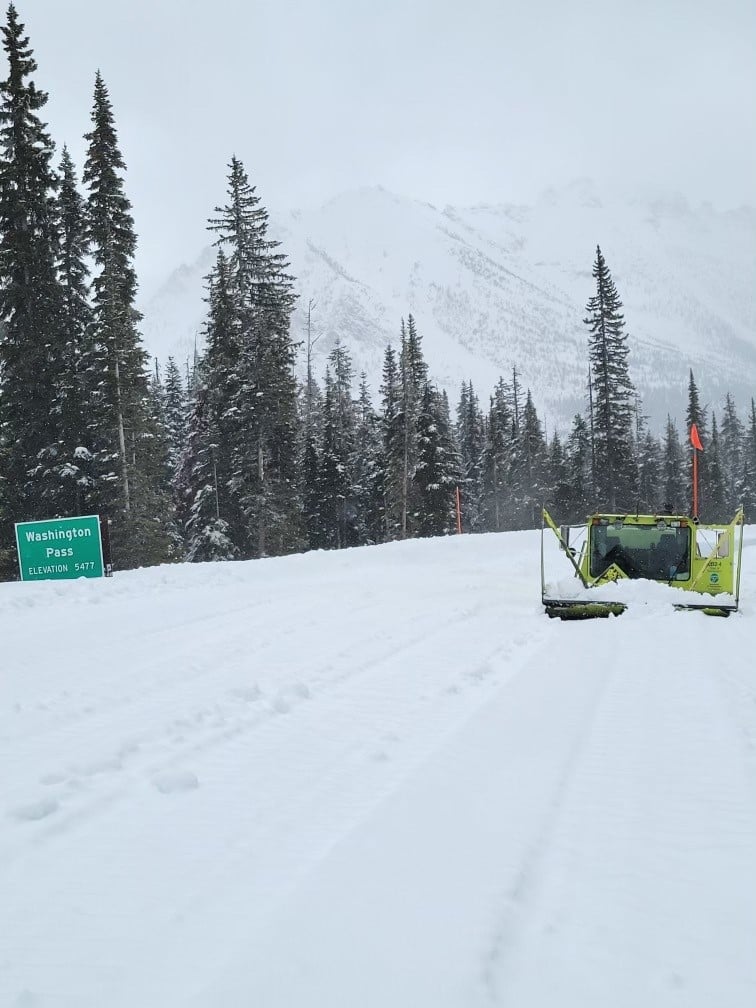 Week 4 of clearing the SR 20 North Cascades Highway is in the books and our east side crews reached the Washington Pass summit, putting them about 10 miles east of our west side crews. There's still quite a bit more to do, though. With snow 8 feet deep on the highway at the top of the pass, they use a Sno-Cat and loader to knock it down and move it to about 6 feet deep for the blower to clear a path on the road. With only initial cuts in the snow, the entire road width and shoulders still need to be cleared and then guardrail and pavement repairs have to be made, as well as any other debris removed. Still no sense on when opening day will be, but when we know, we'll get word out.