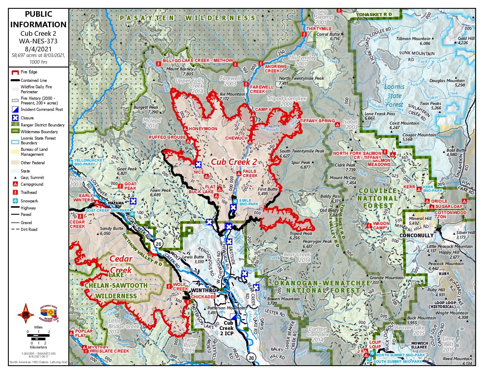 Public Meeting: A public meeting co-hosted by the Southwest Area and Great Basin IMTs was held yesterday evening at Twisp River Park. The Incident Commander and Operations Section Chief for each team gave updates on their fires. Okanogan County Emergency Manager Maurice Goodall discussed evacuations and Twisp Mayor Soo Ing-Moody shared a few words. Representatives from the US Forest Service, Okanogan County Fire District 6, and Washington DNR were on hand to answer questions.