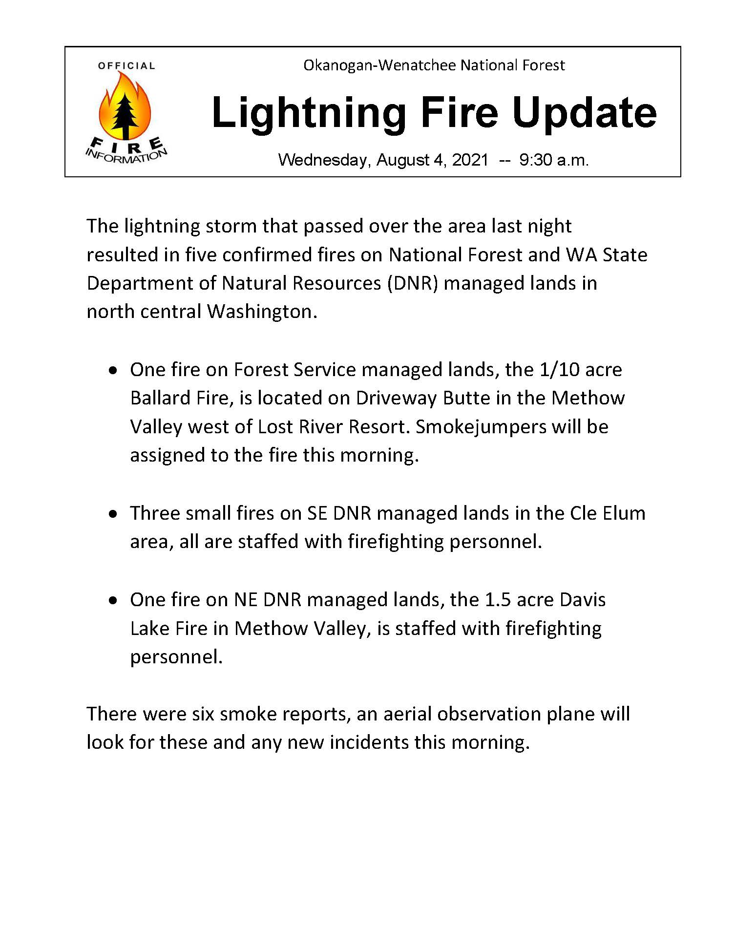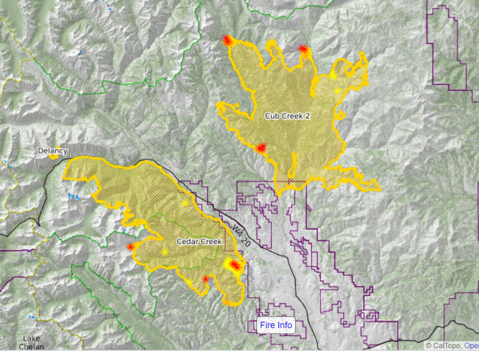 Fire Information Line: Cedar Creek and Delancy Fires: 509-557-0740 (8:00 am to 8:00 pm)