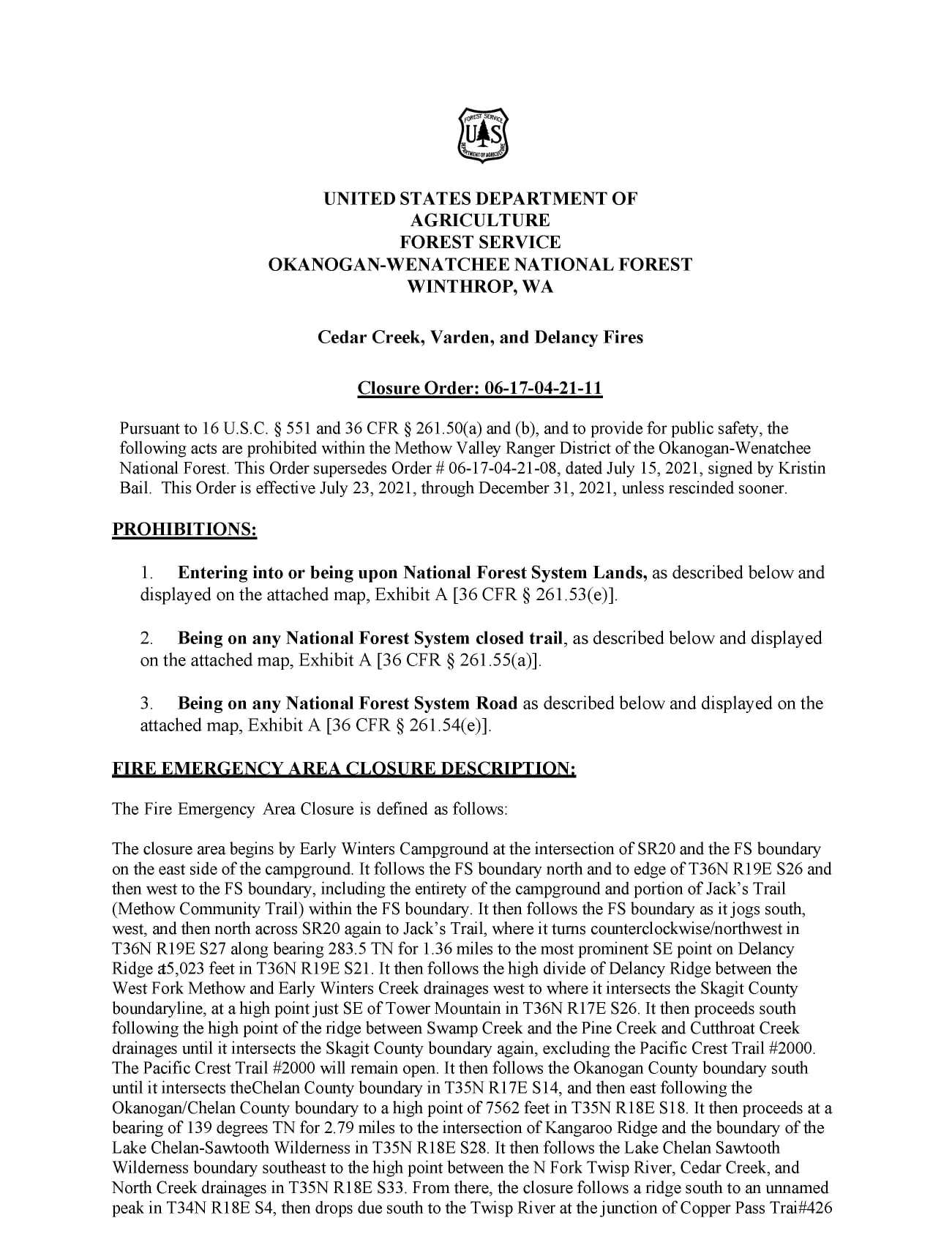 The Okanogan-Wenatchee National Forest has implemented a Fire Emergency Area Closure as of July 22nd, 2021. The Closure includes facilities, roads, and trails. The Closure may be viewed in its entirety at the “Cedar Creek and Delancy Fires 2021” Facebook page.