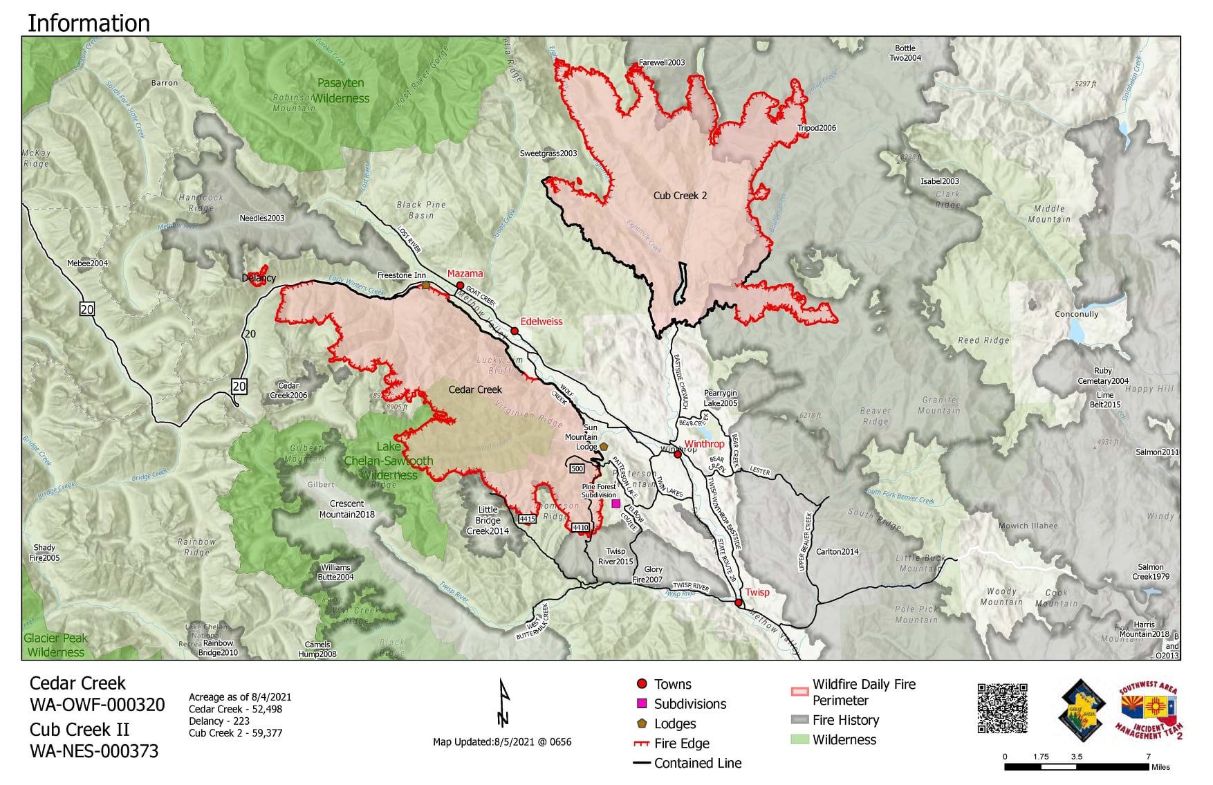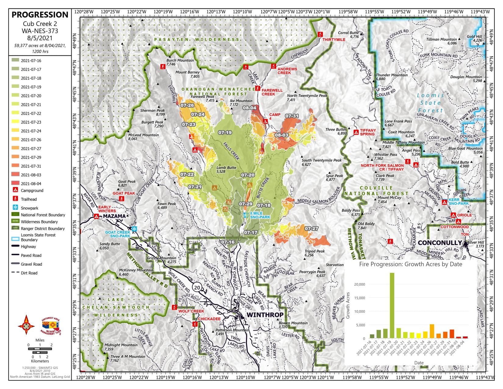 Winthrop, WA — The Cedar Creek and Delancy Fires are burning on the Okanogan-Wenatchee National Forest and public and private lands within Okanogan County. These fires are being managed by Great Basin Incident Management Team 1.