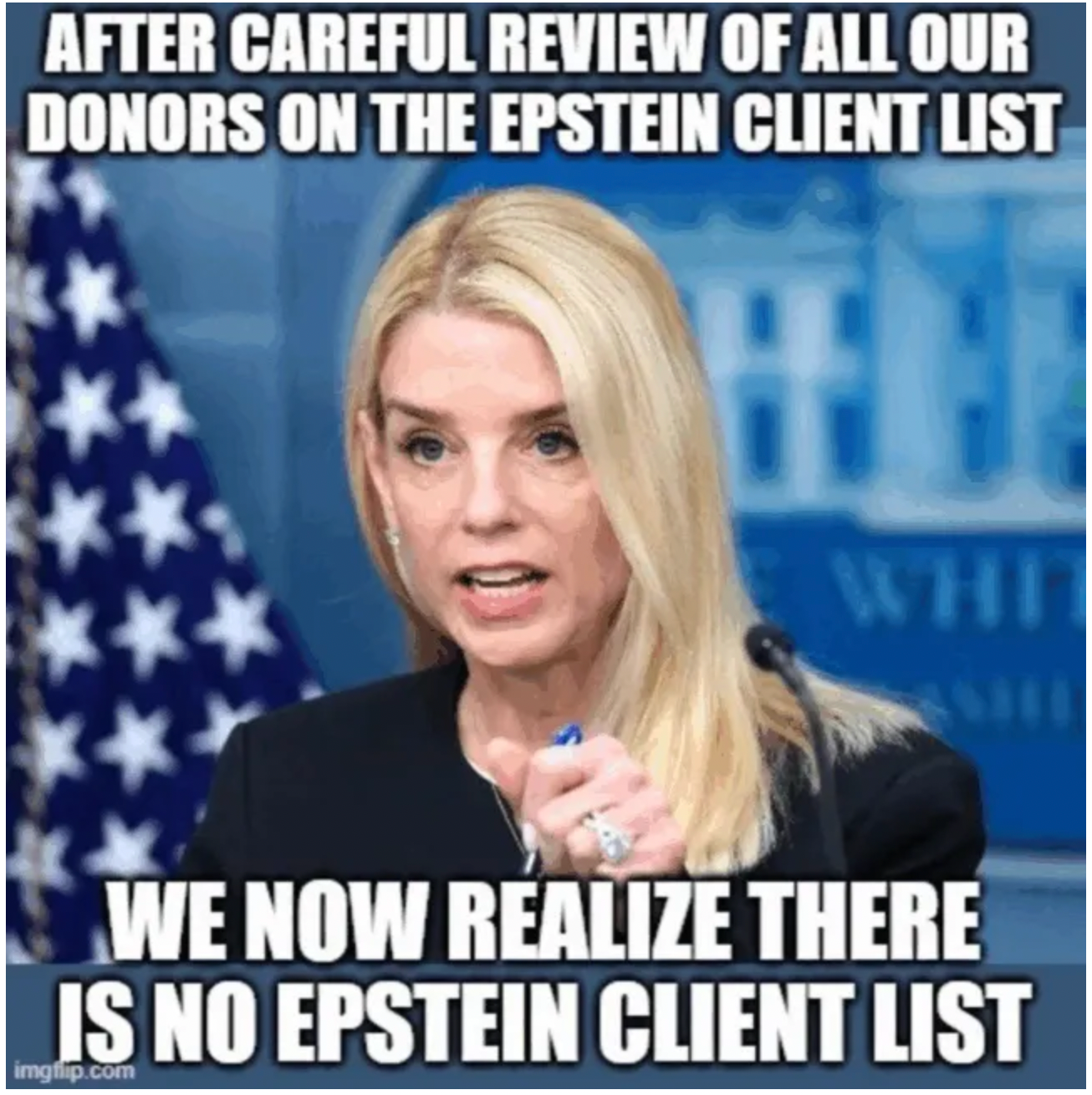 David, whatever the explosive junk is in there it has Trump rattled. Murdoch's WSJ wouldn't publish their piece in the face of Trump's direct threats unless they had rock solid confirmation. Same with the NYT and its piece. Today's WH comments that they're asking Bondi to release the court testimony is of course a ruse because 1) it's not up to Bondi, the judge has to approve 2) the testimony is relevant to Epstein and Maxwell, not Trump and 3) it's the evidence that counts and that is apparently what Bondi will continue to sit on.