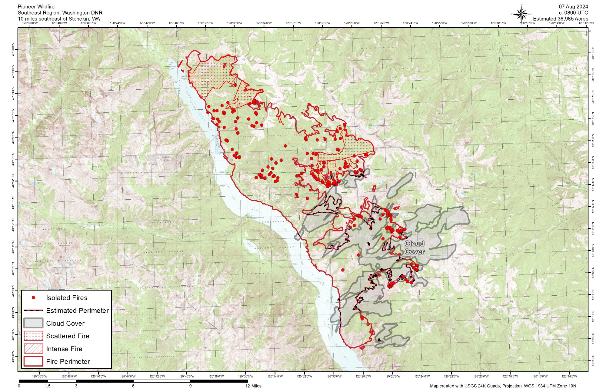 Containment: 12% | Size: 35,477 (No updated IR) | Start Date: June 8, 2024 | Location: 31 miles NW of Chelan, WA | Personnel: 676 | Cause: Human-caused, under investigation