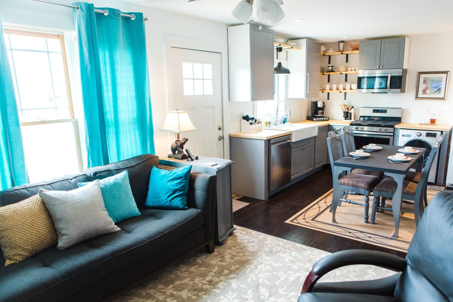 Tucked into the kitchen is a cozy dining area perfect for up to four people. Then, the Smiths and guests can retire to the living area for games and conversation, if they’d like.