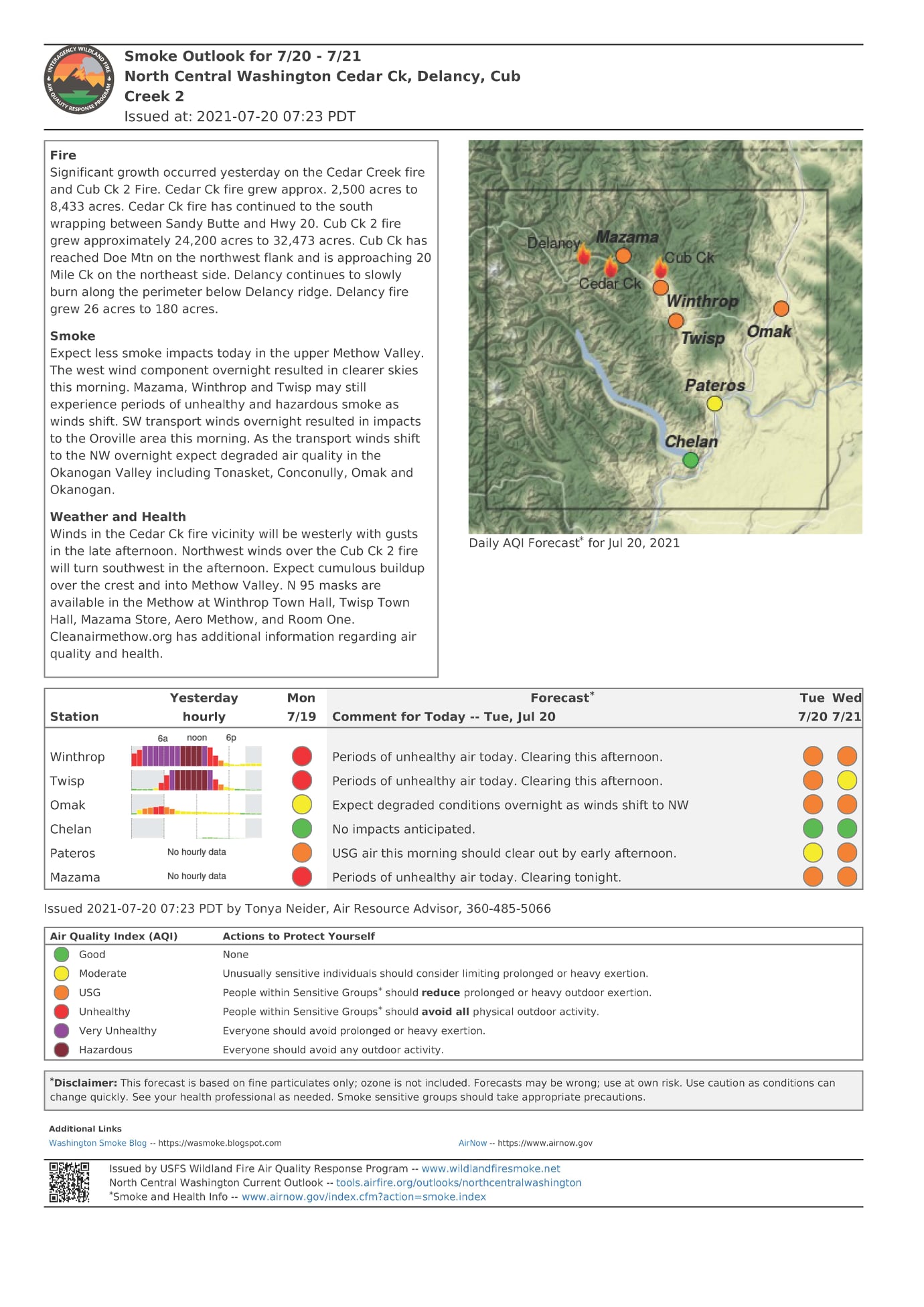 Air Quality: Expect similar smoke impacts today in the upper Methow Valley. Increased impacts will occur in the lower Methow Valley, and the Columbia River Drainage toward Omak. Smoke will settle into the valleys overnight resulting in unhealthy to hazardous air in Winthrop and Mazama between 4:00 am to mid-afternoon. Mazama impacts may be worse today due to increased fire activity yesterday and a forecasted west wind this afternoon. Twisp may experience a shorter period of unhealthy air than Winthrop but should still have unhealthy air in the