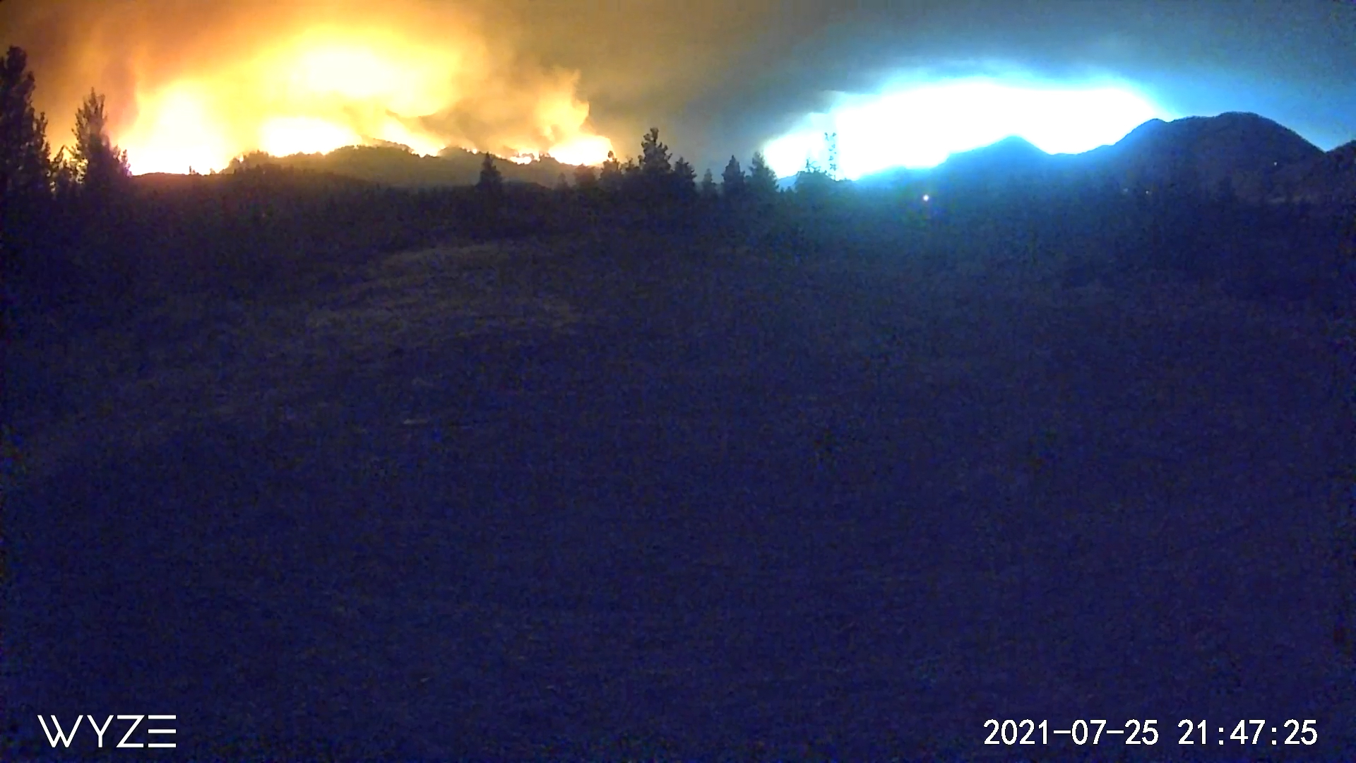 Driveway cam near the end of the straightaway on Wolf Creek Road, looking west toward Virginian Ridge. Fire is backing down the hill.