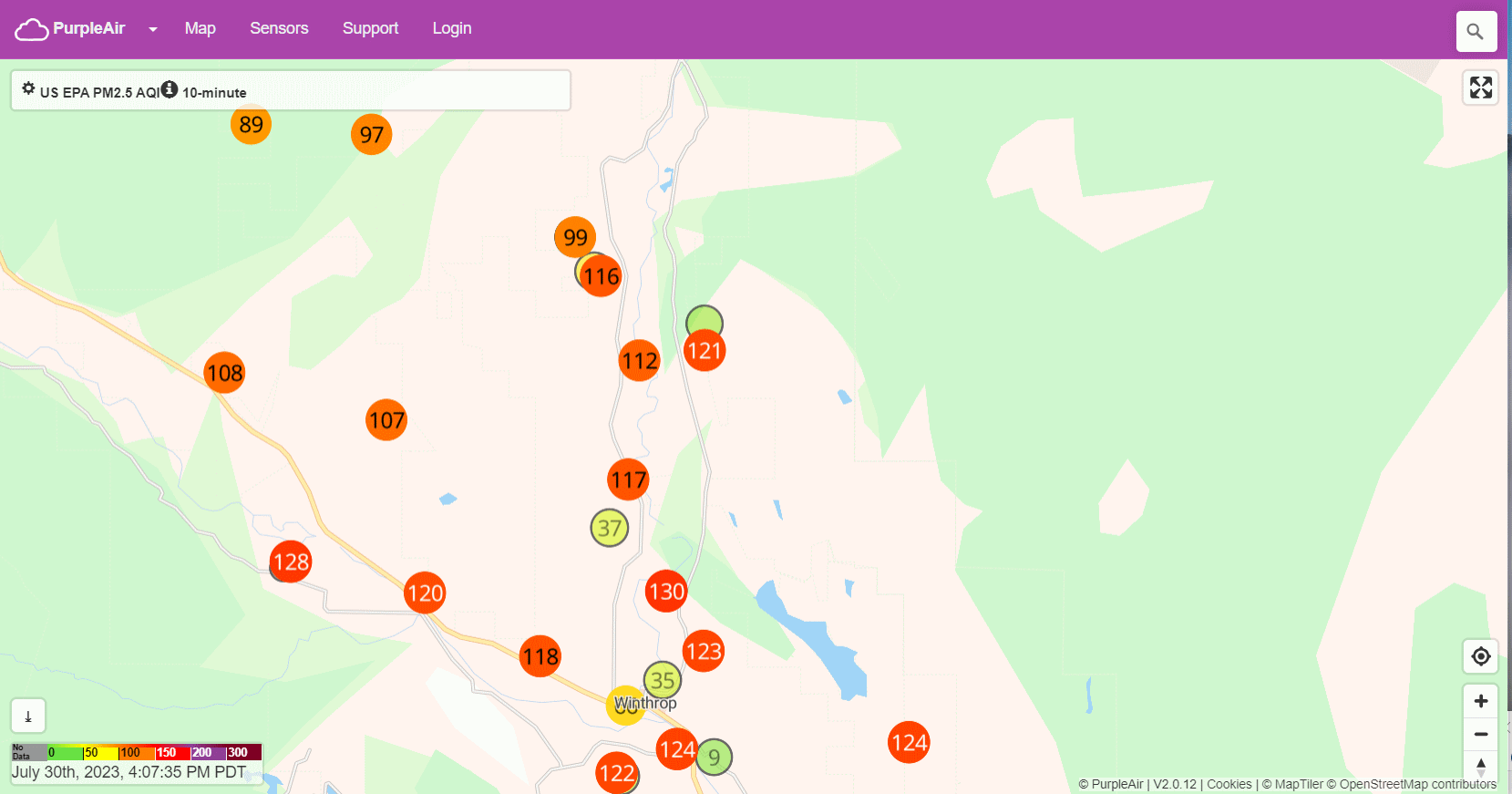 Heavy smoke has arrived in the Methow with Purple Air monitors in the 150's AQ.