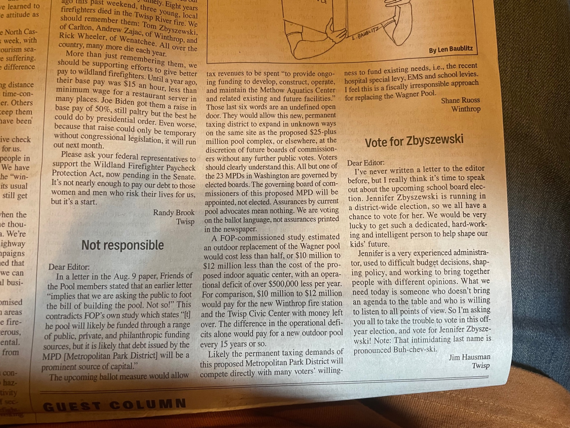 The upcoming ballot measure would allow tax revenues to be spent “to provide ongoing funding to develop, construct, operate, and maintain the Methow Aquatics Center and related existing and future facilities.” Those last six words are an undefined open door. They would allow this new, permanent taxing district to expand in unknown ways on the same site as the proposed $25-plus million pool complex, or elsewhere, at the discretion of future boards of commissioners without any further public votes. Voters should clearly understand this. All but one of the 23 MPDs in Washington are governed by elected boards. The governing board of commissioners of this proposed MPD will be appointed, not elected. Assurances by current pool advocates mean nothing. We are voting on the ballot language, not assurances printed in the newspaper.