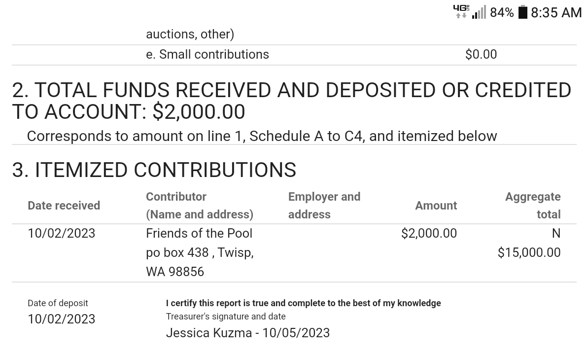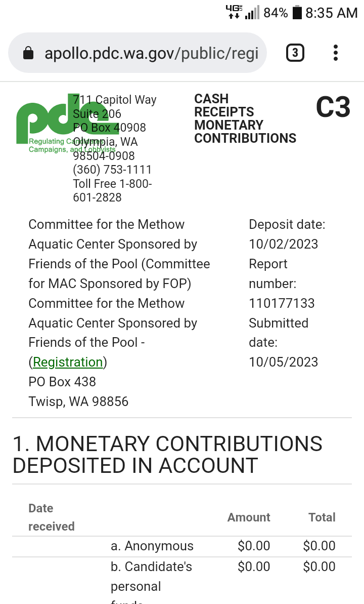 pasayten wrote: Thu Oct 05, 2023 9:37 am Friends of the Pool contributed $10,000 to the "Committee for the Methow Aquatic Center Sponsored by Friends of the Pool" political action committee.