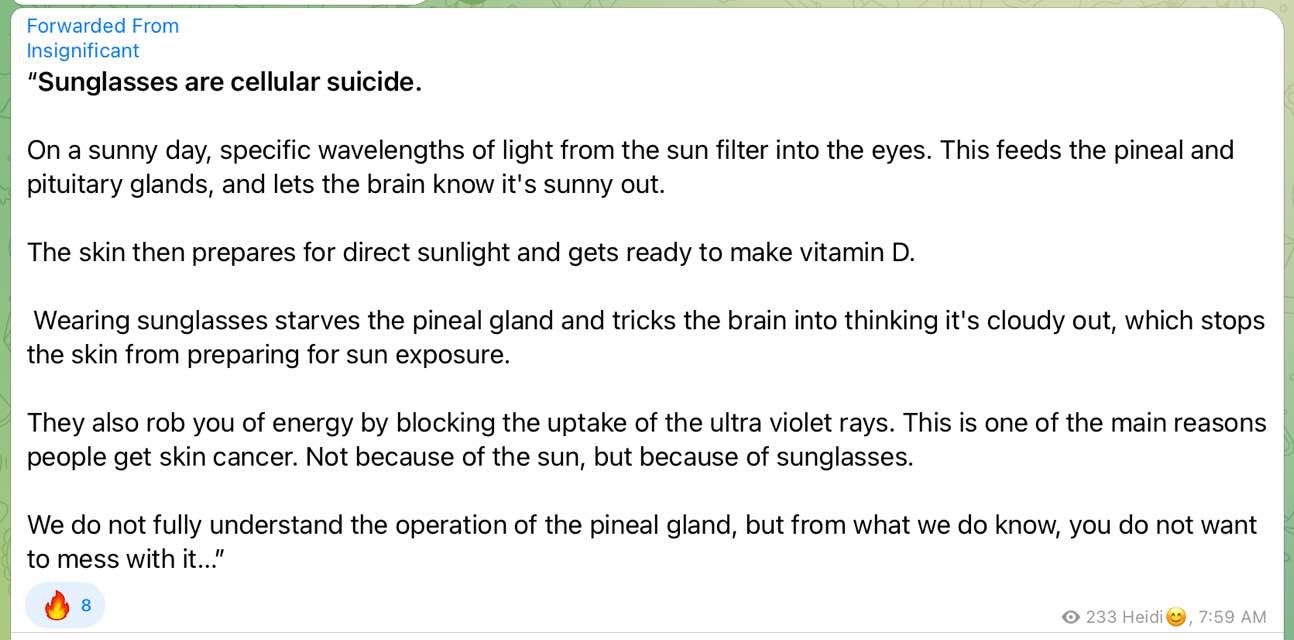 I have thought about sunglasses having a negative effect, and I don't know about the pineal gland, but it seems obvious that it would not be a good thing to wear sunglasses too often. I think that prescription eyeglasses will strain the eyes over time from the magnification, and that will affect the whole body. I don't need to google it. Happy Moonday! The moon is our 20% sunscreen right now, plus you have the clouds so you are safe.