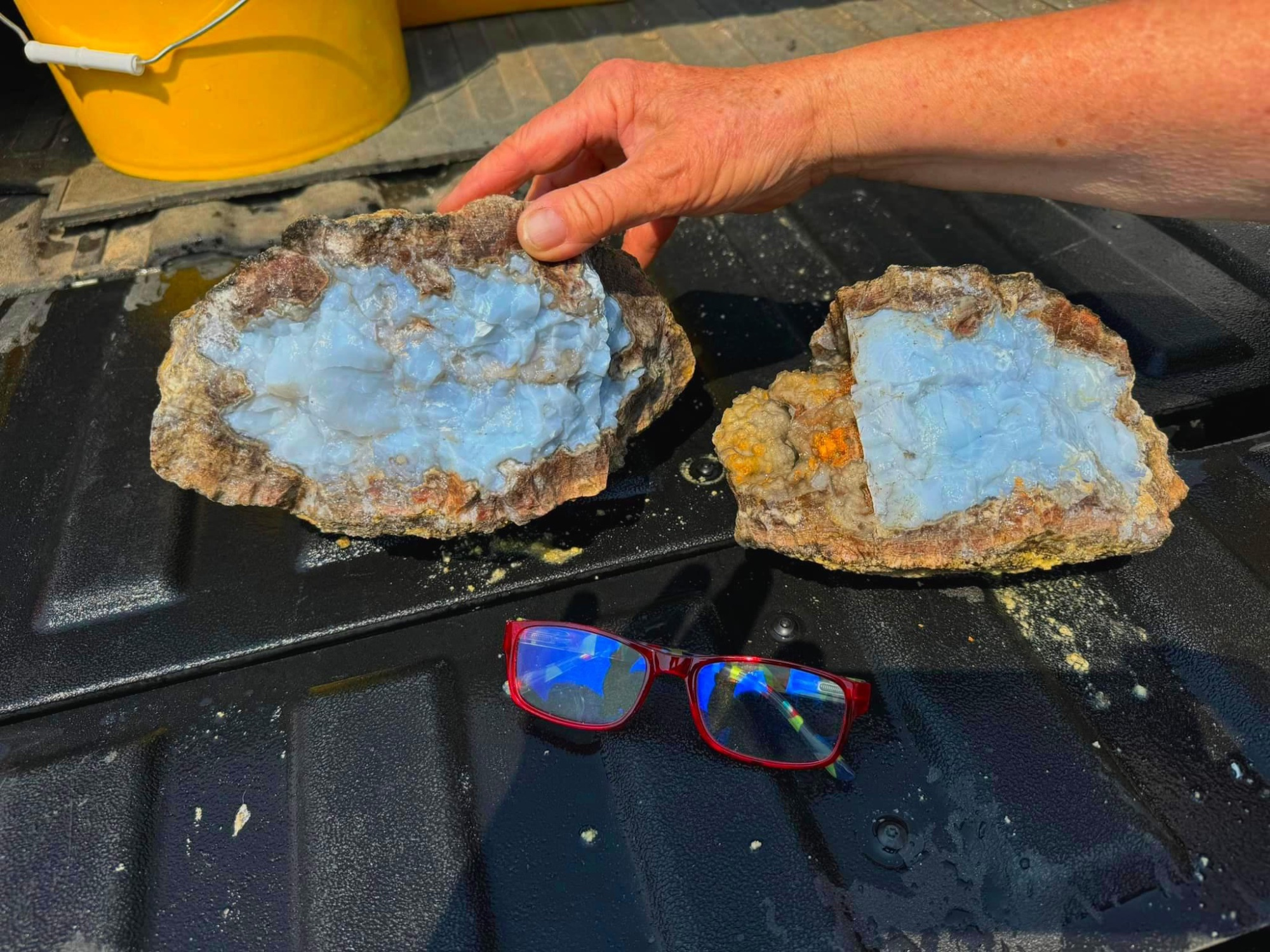 Two weeks of rockhounding... Mostly in the Owyhees... Estimation of a truck bed FULL of rocks in numerous buckets... 1000-1500 pounds... I had to inflate the truck tires to max levels for hauling along with the travel trailer. Picture jaspers, agates, thundereggs, blue opal, fire opal, estate sale of mixed rocks, even a few sapphires…