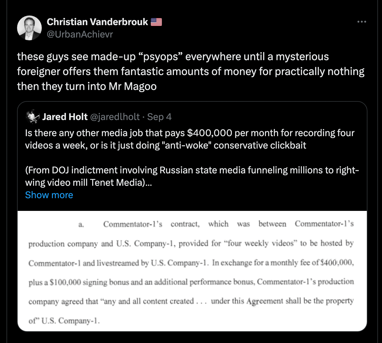 The interesting question, is now that Tim Pool and Benny Johnson know where the money they were being paid came from, what are they going to do next? They can say they "didn't know" but another reasonable question is did you put any effort into finding out who your benefactors were?