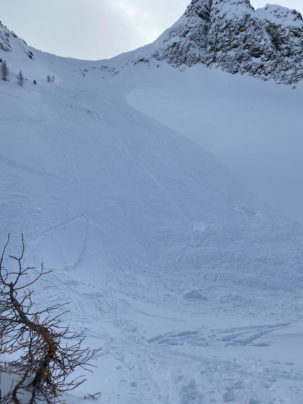 Yesterday (report from Nov 8th)I observed two recent (within 24 hours) slab avalanche releases below the North facing Blue peak col cornice. Surprising to see how large that cornice is this early in the season. Note: Recently built cornices tend to be weak.