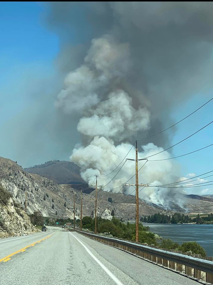 Fire in Stayman Flats area south of Chelan. Fire personnel have responded. First 2 photos courtesy of Gabriella Davila, photo shot from Manson provided by Kari Volyn Axtman and photo from Highway 97-A sent by Whitney Kirby.