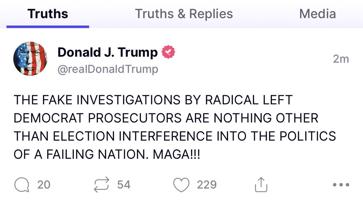 "Jack Smith (nice, soft name, isn't it?), is a political hit man, who is totally compromised, and shouldn't be allowed anywhere near our already highly WEAPONIZED & CORRUPT "Justice" Department and FBI, which are stuffed with, and listening to, Radical Left "MONSTERS," who will cause difficulties for our Country the likes of which we have not seen before," Lumpy wrote. "By the way, OBAMA SPIED ON MY CAMPAIGN (and got caught!), & what about the MASSIVE Joe & Hunter BIDEN CORRUPTION (Evidence already in!)?"