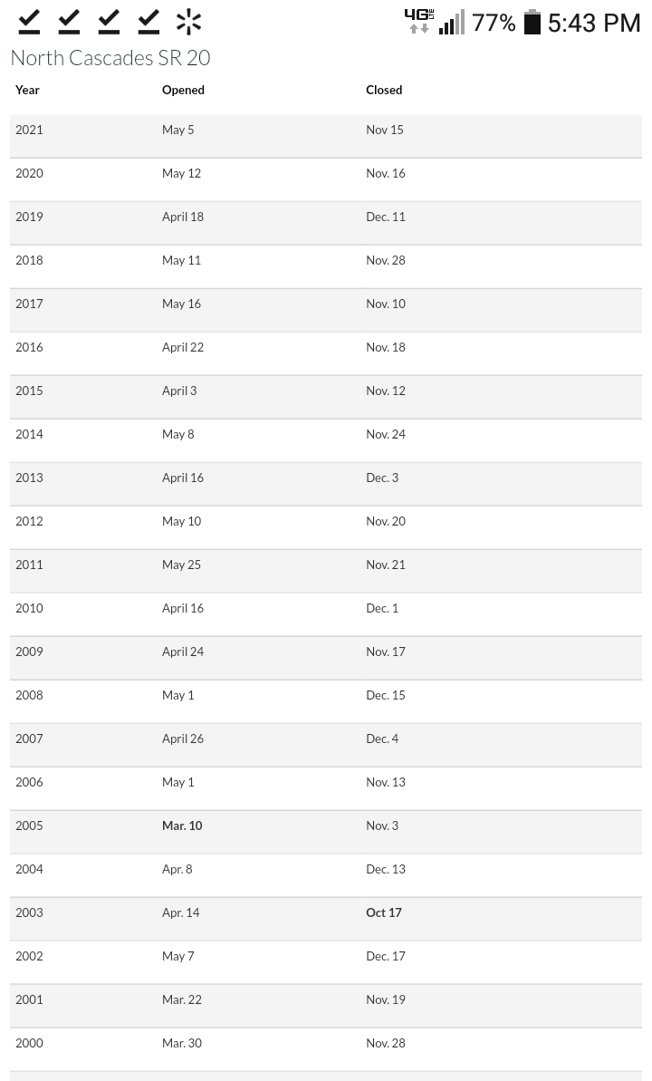 Clearing of the SR 20 North Cascades Highway begins this coming Monday! This usually takes 6 to 8 weeks or so to complete as crews work to reopen one of the most scenic stretches of road in the state."
