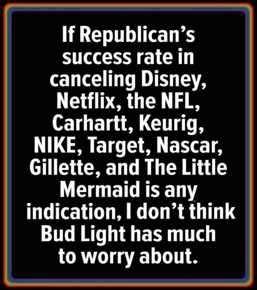 Budweiser stock is up 8.5% for the year so far. And since the boycott began, in the last week, the stock has hit a 52 week high. I see this whole silly effort fizzling pretty quickly.